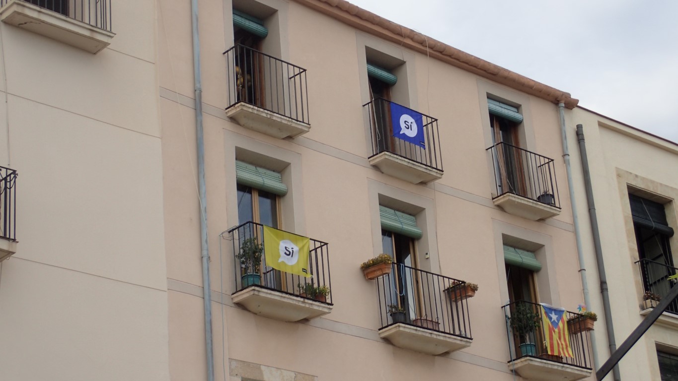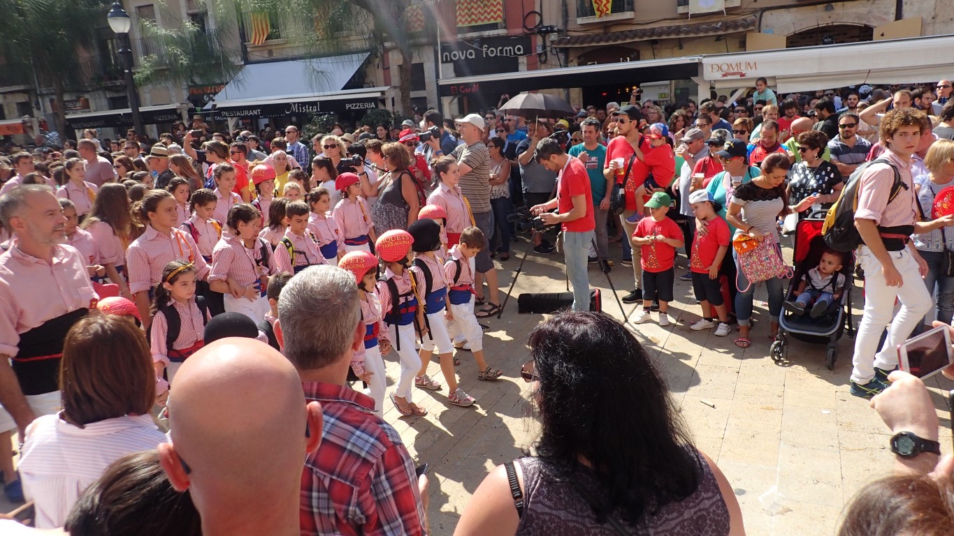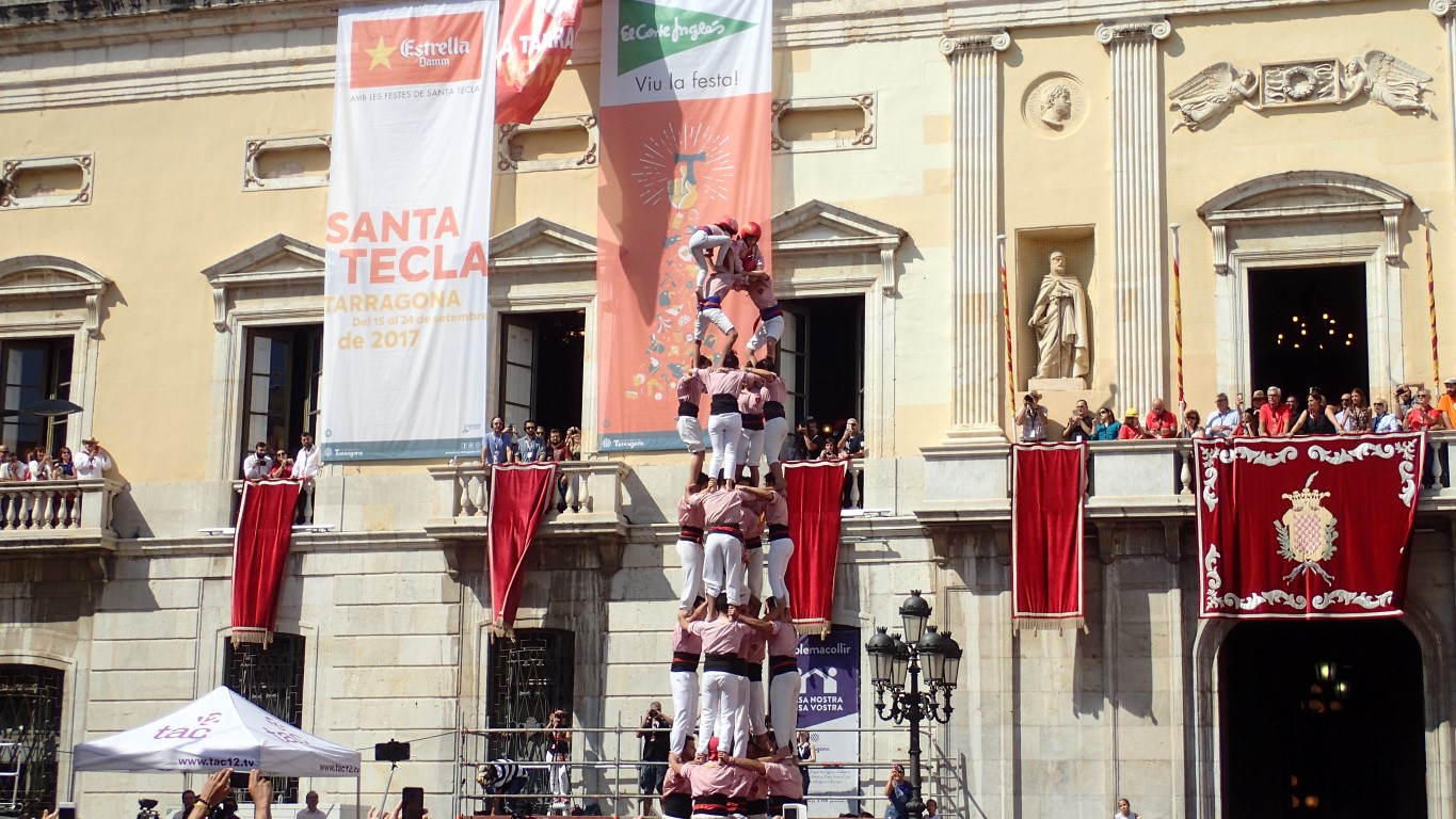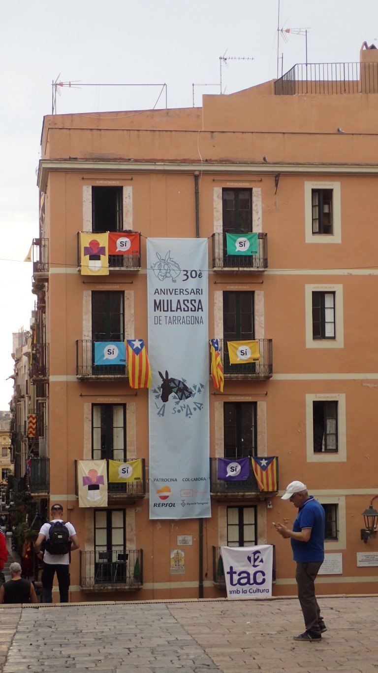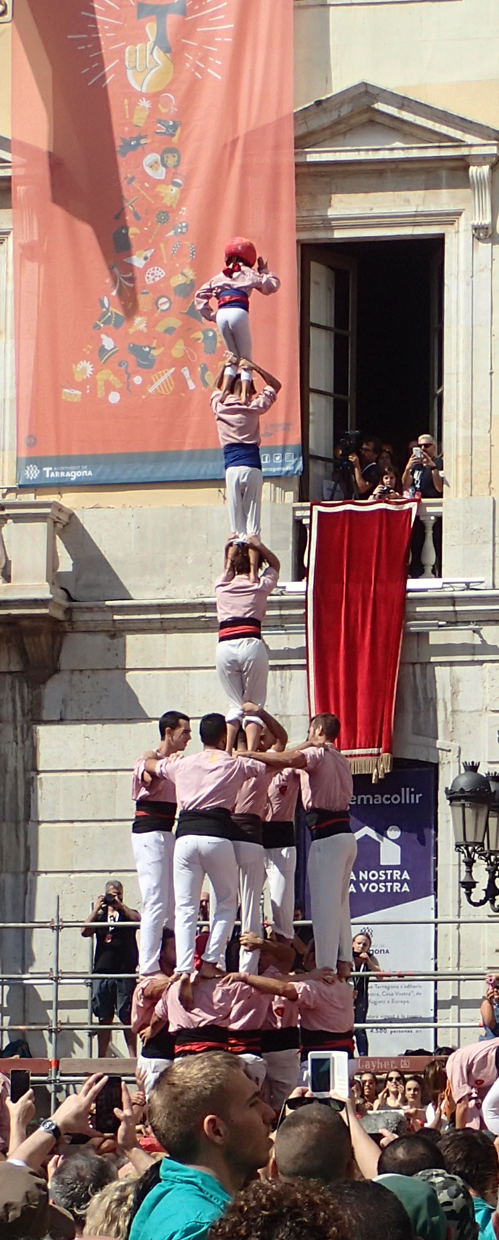 Drove back into town just before midday and parked at a parking station so we could go to the Plaza de la Font to watch the human tower building. The Municipal building is at one end of the square, and it had a stage set up in front of it. When we got there, there was a group of people in costume reciting pieces of poetry, with the occasional display of fireworks and loud bangs. We had no idea what was going on, but clapped along with everyone else. There was a very enthusiastic rendition of what we thought was the Catalonian anthem (Catalonia is currently trying to gain independence from the rest of Spain, there are many pro-Catalonia posters everywhere). And then the 4 teams of tower-builders marched into the square, each heralded by its own band. The teams took turns to build towers of up to 9 people high, in various configurations ranging from 3 people on each level, to just one person supporting another one on his or her shoulders, going up and up … all with little kids wearing helmets at the very top. For anyone who has a child who is a climber, send ’em to Human Tower Building classes at Tarragona. They will either love it, or decide they’re not so keen on climbing after all.
