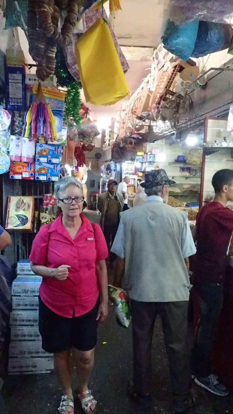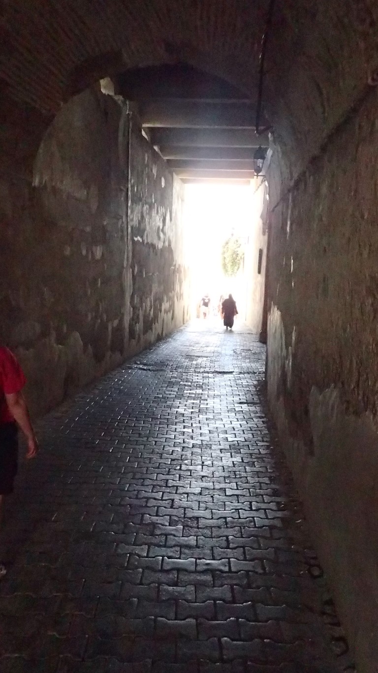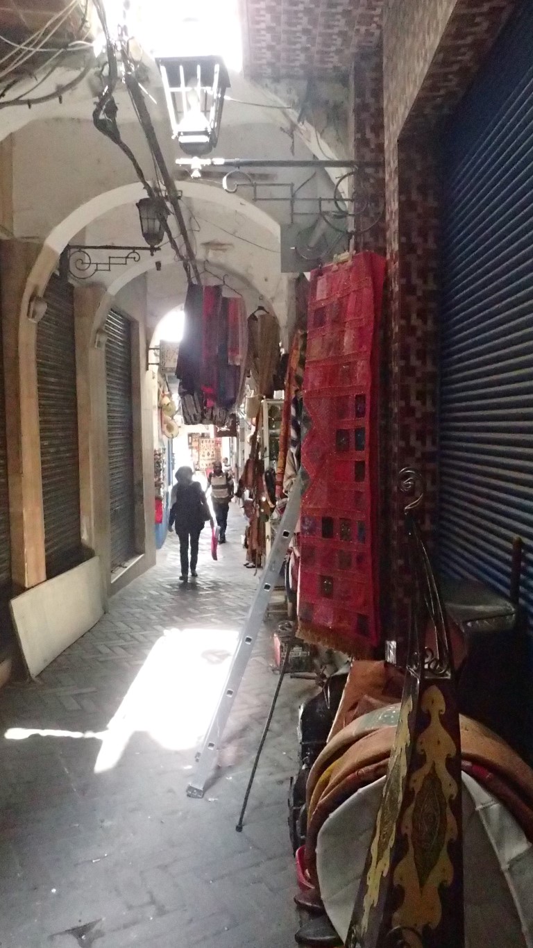 We wandered down streets and lanes which got progressively narrower, until we got to the market, where there were rows of stalls all selling similar items – a row of dried fruits and nuts; a row of olives and the most beautiful preserved lemons (note to self: learn how the Moroccans do it!); a row of bags of herbs and piles of colourful spices and then to the butchers and fishmongers. We found an old man selling pieces of hot potato omelete from a huge flat pan in a lane and he was doing a very brisk trade at about 10c/piece. A local shopkeeper was very keen to buy a piece for us, and we were even more keen for him not do to that and to just buy our own, knowing there would be an expectation that we visit his shop … and you can guess the rest of that scenario. So we bought our own pieces which were served on pieces of butcher’s paper. That didn’t stop the shopkeeper from trying very hard to get us into his shop but like I said, we’re good at saying ‘no’. We kept on walking higher to the Kazbah (citadel), then back down through lanes selling haberdashery, clothing and I’ve forgotten what else.