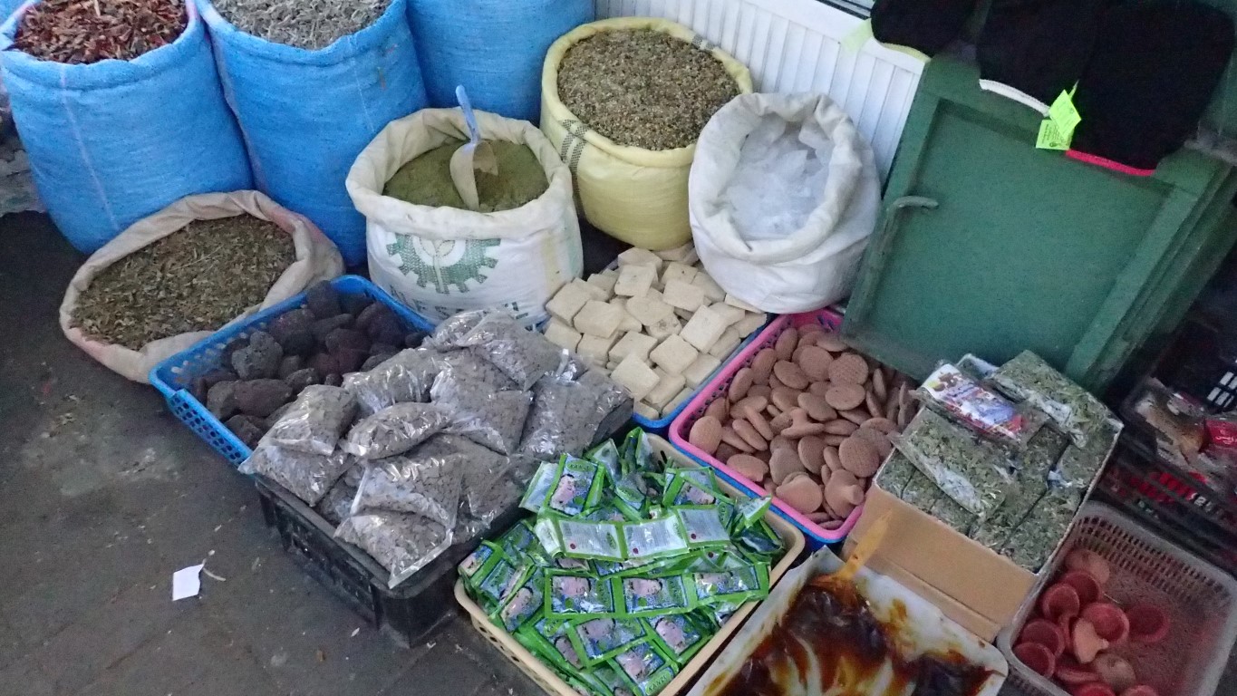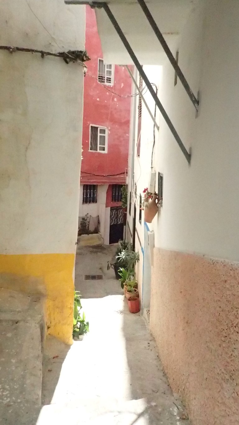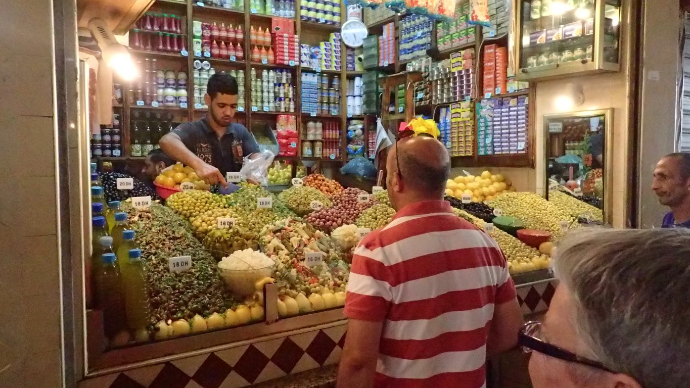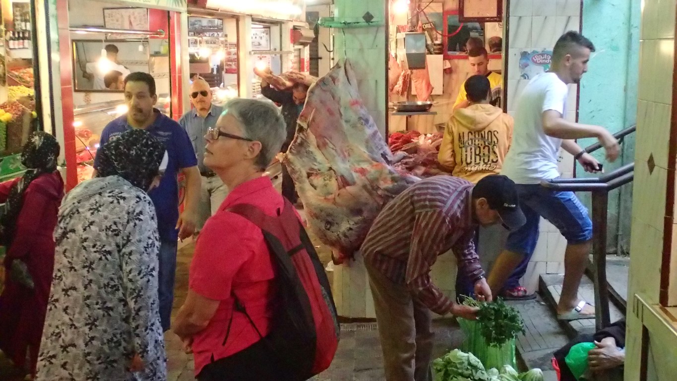 We wandered down streets and lanes which got progressively narrower, until we got to the market, where there were rows of stalls all selling similar items – a row of dried fruits and nuts; a row of olives and the most beautiful preserved lemons (note to self: learn how the Moroccans do it!); a row of bags of herbs and piles of colourful spices and then to the butchers and fishmongers. We found an old man selling pieces of hot potato omelete from a huge flat pan in a lane and he was doing a very brisk trade at about 10c/piece. A local shopkeeper was very keen to buy a piece for us, and we were even more keen for him not do to that and to just buy our own, knowing there would be an expectation that we visit his shop … and you can guess the rest of that scenario. So we bought our own pieces which were served on pieces of butcher’s paper. That didn’t stop the shopkeeper from trying very hard to get us into his shop but like I said, we’re good at saying ‘no’. We kept on walking higher to the Kazbah (citadel), then back down through lanes selling haberdashery, clothing and I’ve forgotten what else.