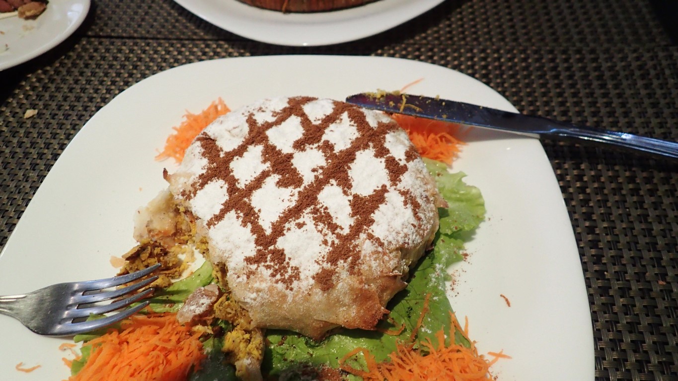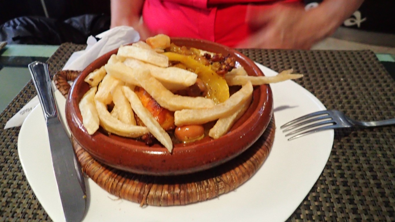 Lunch was at a restaurant back in the new part of town. Chicken pastilla and a milkshake for Greg, chicken tagine with mint tea for me, and we shared a chocolate & banana crepe for dessert. That chicken pastilla has set a new high in chicken pies for Greg and now he wants all future pies to be decoratively dusted with icing sugar and cinnamon! The food was delicious and all up it cost around AUD 22. We walked a bit more and found some shade under some eucalyptus trees in a park, then went to the beach, walked some more and got back to terminal to catch the almost-empty 6pm ferry.