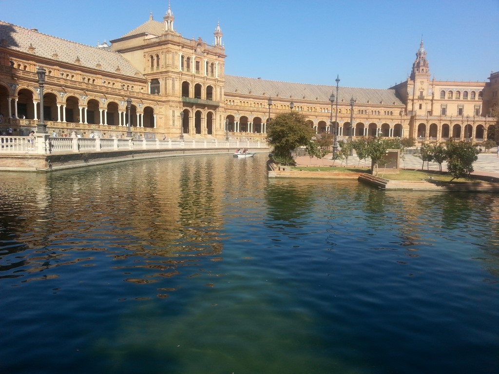 We walked a few blocks to the Plaza de Espana and the adjoining Parque de Maria Luisa. The Plaza was built for the 1929 Exposicion Iberoamericana and has fountains, mini-canals with boats for hire and a huge curved brick & tile building showcasing Seville tilework. It was a hot day and we opted to sit under a huge Australian Grevillea Robusta in the park rather than walk around the Plaza. Then we headed back to the car via the river. We’re listening to the audiobook of Ken Follet’s Column of Fire, Part 3 of his Kingsbridge series, and the Rio Guadalquiver is mentioned several times as an important asset to Seville because ships were the main form of transport to and from the city. It has silted up over the centuries, but is still an impressive body of water.