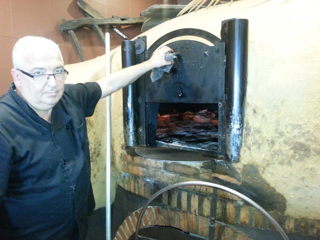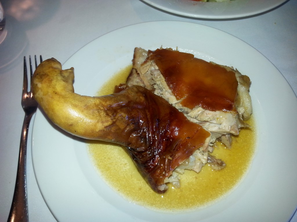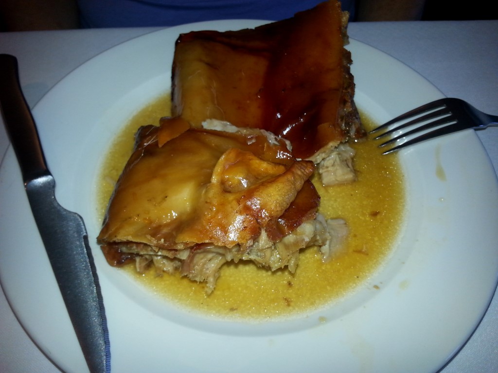 While we were reading up in our Lonely Planet Guide about the aqueduct, we learnt that Segovia is also well known for its roast lamb and roast suckling pig. We tend not to eat out much when we travel because I like to cook like the locals cook, but we do like a good roast, so we found a restaurant which specialied in horno de asar roasts and had a lovely lunch: Entree – ‘grandma’s soup’ and butter bean stew, Main – cochinillo asado roast pork with salad, Dessert – arroz con leche creamed rice for Greg and creme caramel for me. Plus wine.