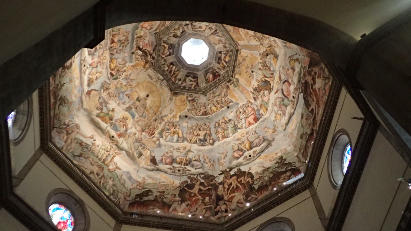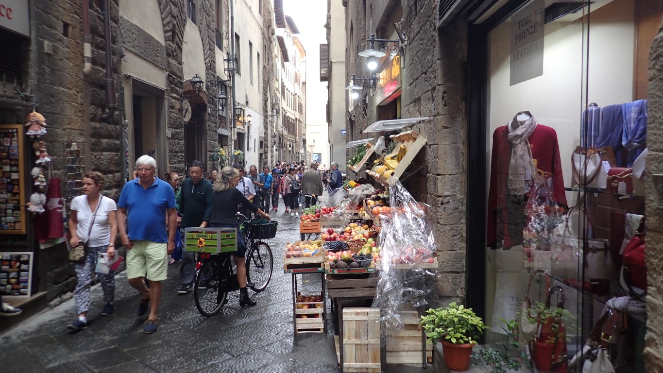 So we did what we do best … we walked as much as we could. Parked along the river not far from the Ponte Vecchio, walked across the bridge and went to gaze at the replica David standing outside the Palazzo Vecchio and to sneak a peek at the Fountain of Neptune which is being renovated and currently behind boards and shadecloth. Wandered along lanes and streets to the Cattedrale di Santa Maria del Fiore Florence Cathedral. We queued to go inside and Greg got stopped at the entrance because his shorts were too short (!!), but then the guard just motioned for him to lower them a bit and let him in. Then to the Basilica San Lorenzo, a few other piazzas (or is that piazzi?), back over another bridge, crossing the road whilst dodging a motorcyclist who was far too busy looking over his shoulder to look where he was going and see us, down a few more lanes and streets, back to the car and back to Greve.