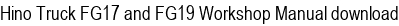 Hino Truck FG17 and FG19 Factory Service Workshop Manual on PDF can be viewed using free PDF reader like adobe or foxit or nitro . File size 9 Mb PDF searchable document. Note: does not include Engine General Information Clutch Clutch Control Transmission control Propeller Shaft Differential Carrier Rear Axle Front Axle Steering Power Steering Service Brakes Exhausr Brake Suspension Chassis Frame Cab Electrical Equipment Wheels Tyres ..plus lots more Hino Truck FG17 and FG19 Factory Service Workshop Manual full details